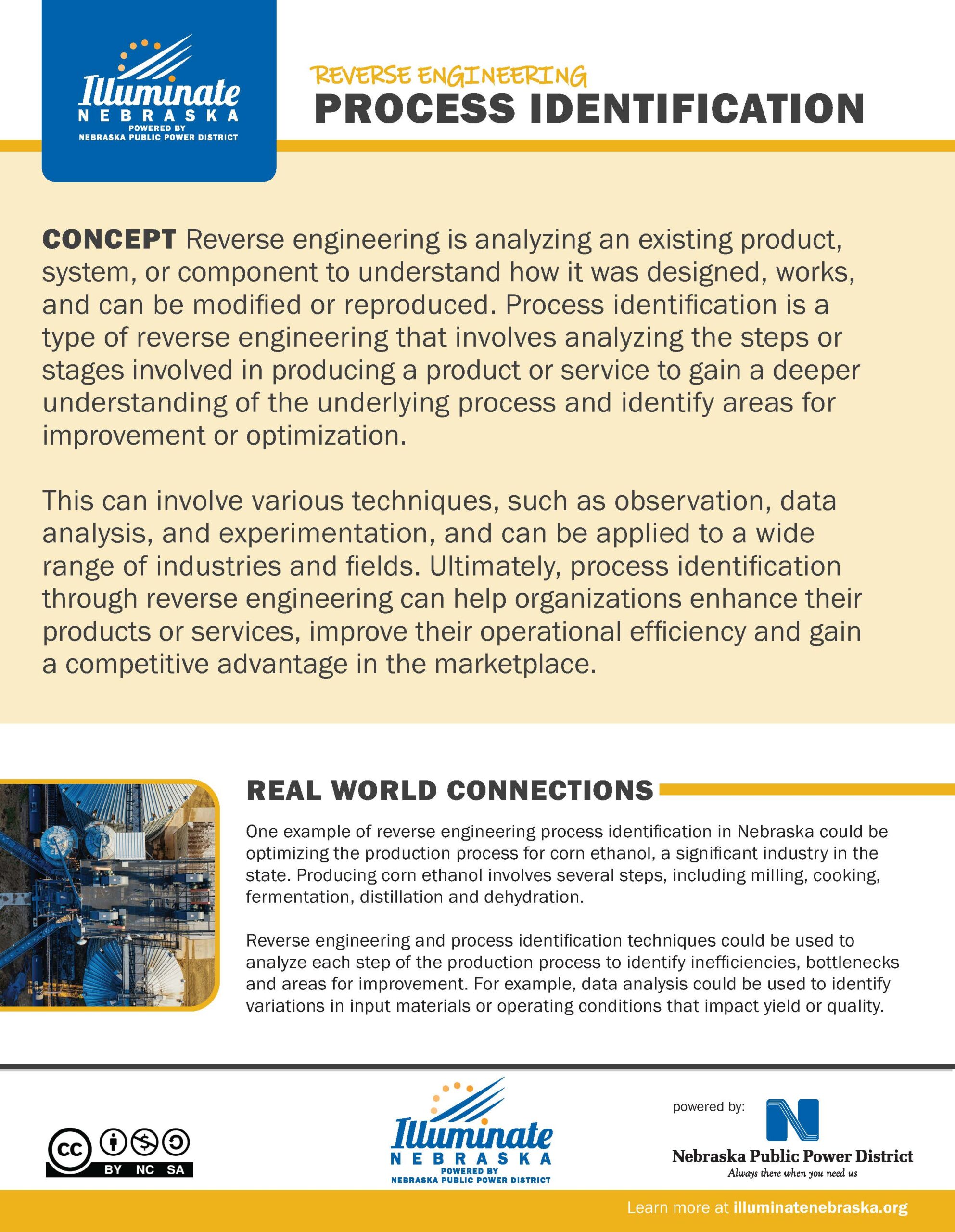 Reverse engineering is analyzing an existing product, system, or component to understand how it was designed, works, and can be modified or reproduced. Process identification is a type of reverse engineering that involves analyzing the steps or stages involved in producing a product or service to gain a deeper understanding of the underlying process and identify areas for improvement or optimization.