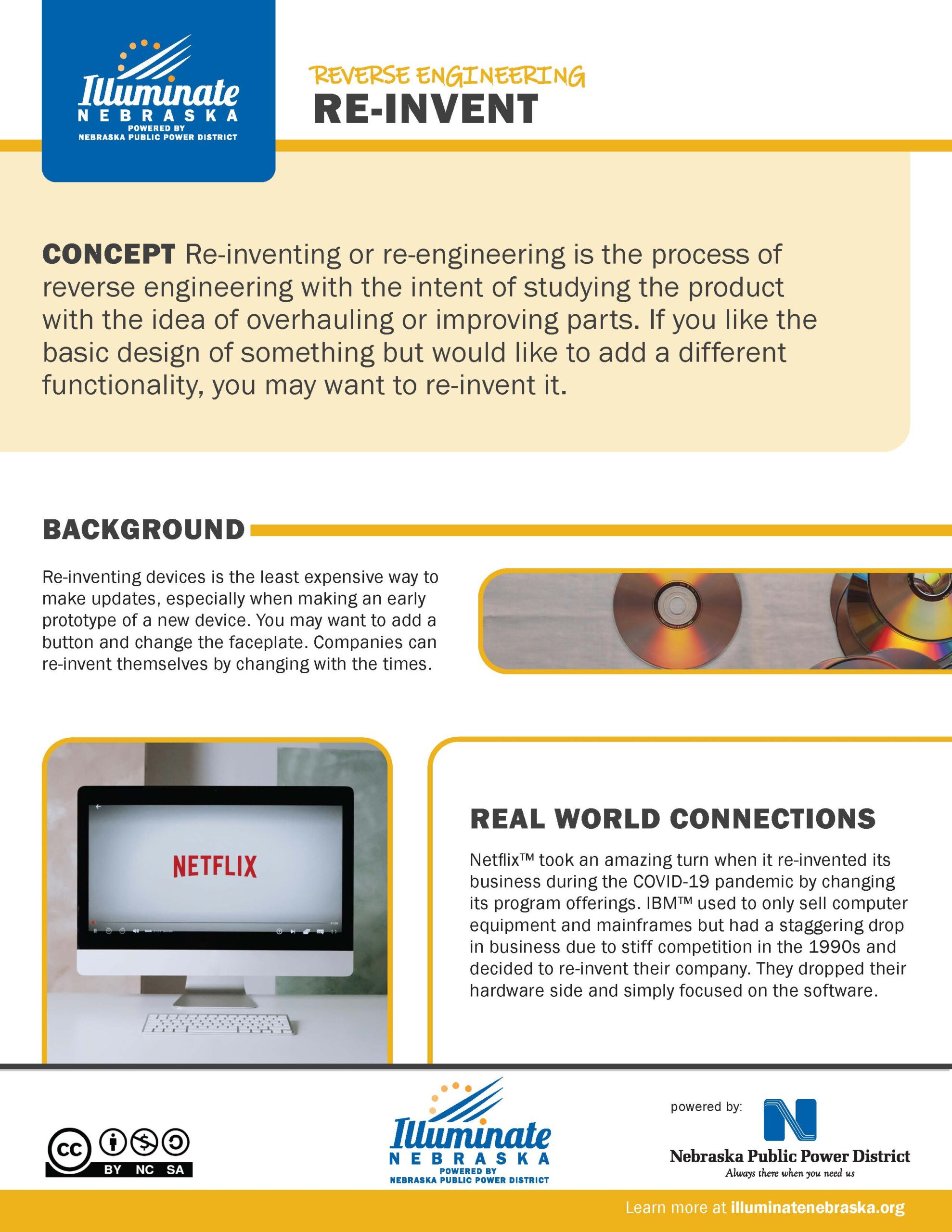 Re-invent or re-engineer is the process of reverse engineering with the intent of studying the product with the idea of overhauling it or improving parts of it. If you like the basic design of something but would like to add to it a different functionality, you may want to re-invent it.